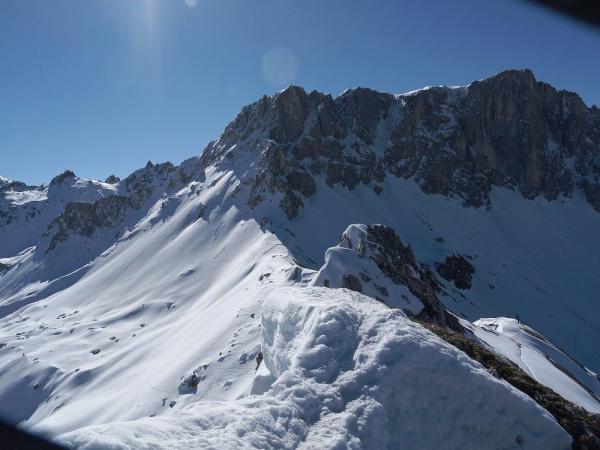Schnee: im Aufstieg unten nicht gefroren, ganz oben Harsch/Firn, dann tiefer Griesschnee/Sumpf mit tragendem und nicht tragendem Deckel in kleinräumigem Wechsel