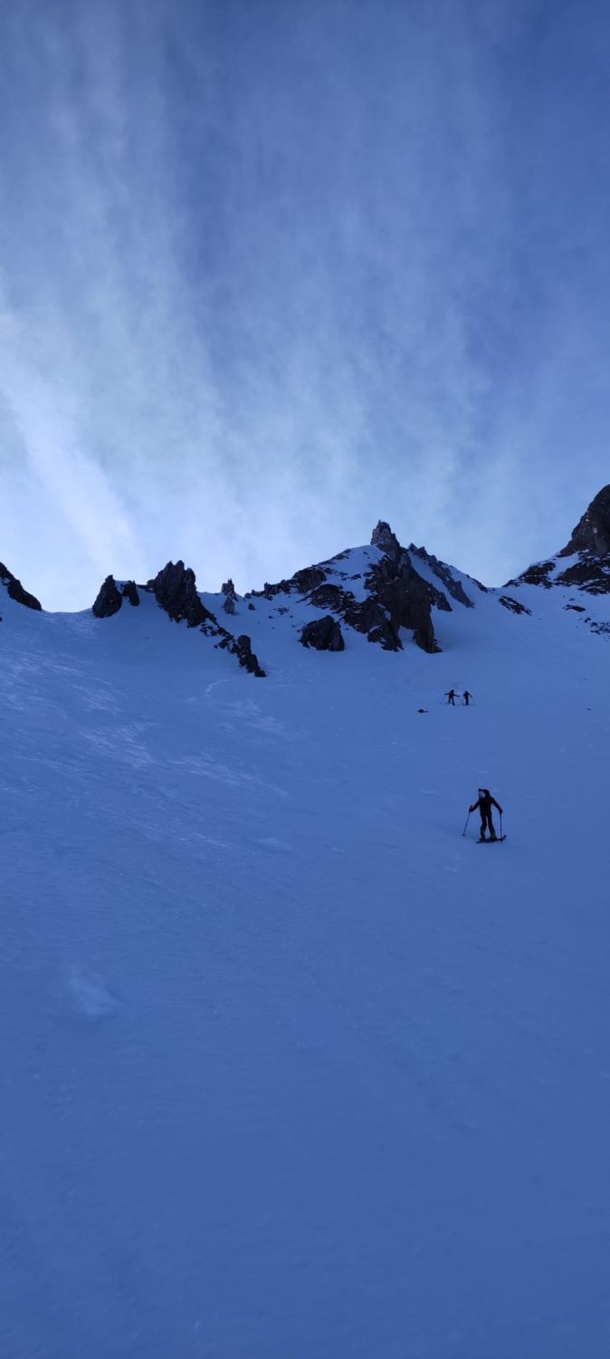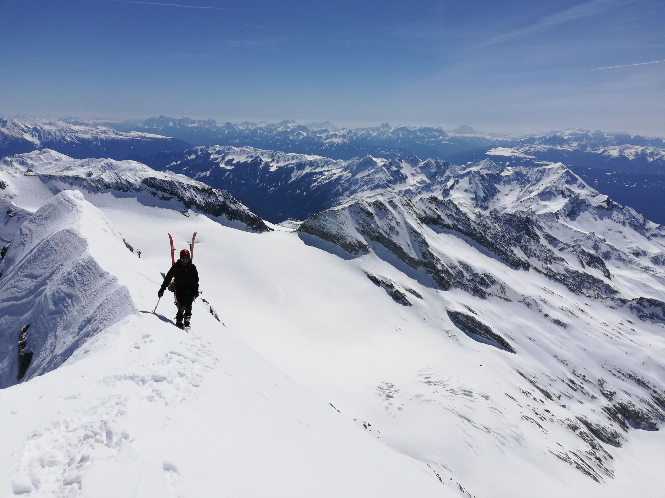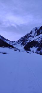 Die Straße ist aktuell ab kurz nach dem Gasthof Stein nicht befahrbar, daher starteten wir dort um ca. 5 Uhr morgens. Dadurch ergeben sich rund 2300 Höhenmeter. Es wird voraussichtlich noch einige Wochen dauern, bis die Straße bis zur üblichen Startstelle (dritte Kehre) befahrbar wird. Bis etwa 20 Minuten oberhalb der dritten Kehre müssen die Ski getragen werden.