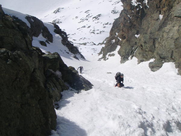 Wer die Couloirs nicht fahren will, kann seine Ski gleich am ersten Couloir stehen lassen. Die kurze Querung zwischen den beiden Rinnen ist man schneller zu Fuß gegangen wie 2 mal Ski mit Steigeisen tauschen.