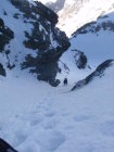 Die beiden Couloirs - vor allem das erste - haben trotz sehr warmer Temperaturen kaum aufgefirnt. Unüblich für eine hauptsächlich südlich ausgerichtete Tour wäre an diesem Tag auch eine spätere Abfahrt als 11 Uhr gut vertretbar gewesen.