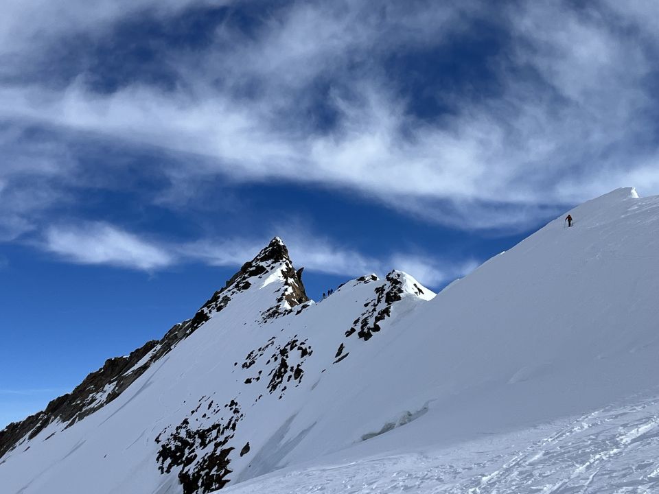 Der ganze Aufstieg unangeseilt (wie alle anderen an dem Tag auch). Am Anfang die erste Steilstufe mit Harscheisen danach gute Spur. Gletscher ist gut zugeschneit auch wenn überall immer wieder eine gute Routenwahl erforderlich ist. Gletscherabbruch unterhalb des Südgrats vom Nordend schnell passieren. Spaltenzone ab 4200m ohne grosse Umwege gut zu durchgehen. Verhältnisse am Grat ausgezeichnet. Super ausgetretene Spur einzelne, etwas eisige Passagen aber mit etwas Geschick gut zu durchlaufen. Kletterei praktisch schneefrei. Abfahrt durch teilweise Pulver/Bruchharsch/windgepressten Schnee fast alles angetroffen. Vor dem Wetterumbruch waren wir wieder bei der Saaser Lücke. Die Abfahrt nach Zermatt durch die Schlucht wird nicht mehr empfohlen und wurde vermutlich am Samstag morgen früh das letzte mal mit Mühe und Not gemacht (gem. Hüttenpersonal). Etwas westlich von P. 3505 kann man den Steilen Hang abfahren und kommt so sehr direkt zur Saaser Lücke ohne grossen Gegenanstieg (2min Stapfen bis zum „Klettersteig“. Nach der Saaser Lücke und der Abseilstelle kann man, wenn man etwas hoch bleibt (20hm hochbretteln) ohne Gegenanstieg den ganzen Gornergletscher bis auf ca. 2700 abfahren (im unteren Teil markiert mit Stangen) bis zum Einstieg des Wanderwegs. Dann komplett Schneefrei bei gefühlt 15°C nach Rotenboden (ca. 1:20h) gelaufen. Südhänge sind bis hoch oben aper. Von dort auf Skipiste bis nach Furi, dann nochmal kurz Ski tragen auf der Verbindung zur Piste nach Zermatt.