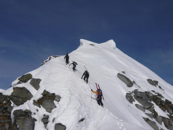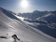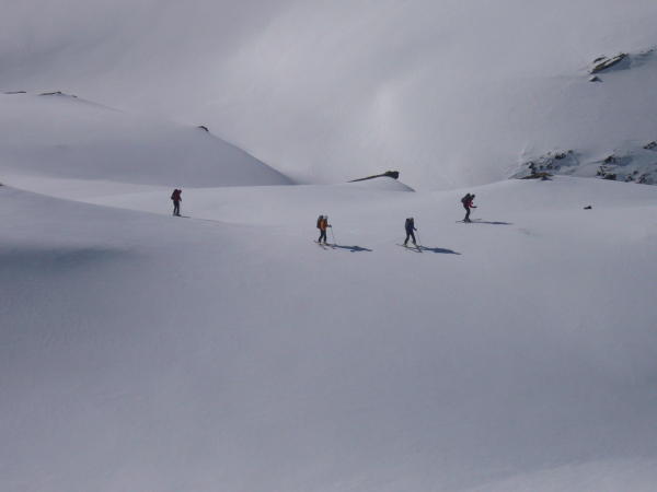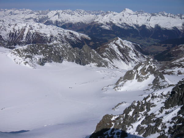 Von Vrin 1,5h Fussmarsch bis zur Aua da Diesrut unterhalb der Alp Diesrut auf ca. 1800m am Fluss Umstieg auf Ski. Schneedecke morgends tragfähig. Im Tagesverlauf und Sonneneinstrahlung schnell aufweichend. Vor allem in der Ebene zahlreiche Wummgeräusche. Grat nach Furcola Sura da Lavaz gut am kurzen Seil begehbar, Tritte im Schnee möglich, wenig Fels. Abfahrt auf Wanderweg bis kurz oberhalb der Alp Sura möglich. Schneegrenze ca. 2000m