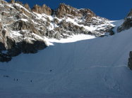 Piste Argentière bis Argentièregletscher morgens um 07h00 noch gut gefroren. Argentièregletscher - Glacier du Milieu - Couloir gut tragend, im obersten Teil Milieugletscher etwas lästig in den alten Abfahrtsspuren (ohne Harsteisen bis Skiaufbindstelle möglich. Couloir gut gespurt ("Treppe"...). Wenig Blankeis auff letzten 30hm. Abfahrt im Supersülzli bis Höhe Argentièrehütte, dann zunehmend nass. Abfahrt gerade noch knapp bis Parkplatz Bergbahn im Dorf möglich.