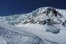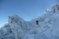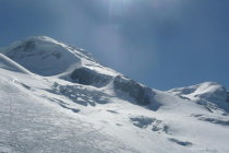 Abfahrt via Grand und Petit Plateau: Gleich zu Beginn einige grosse Spalten mit nicht mehr allzu stabilen Brücken. Die gefährlichen Hängegletscher weiter unten haben viel Material fallen gelassen. Eine Querung ist mit Skiern knapp möglich, aber mühsam. Danach muss mit Skiern noch eine ca. 10m Blankeispassage abgefahren werden (jedoch darunter nicht ausgesetzt) und eine zweite Rippe mit sehr wenig Schnee/Eis wird zu Fuss abgestiegen oder für mutige evtl. auch abgerutscht.