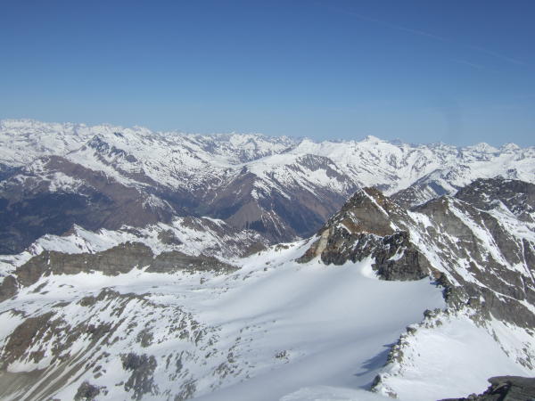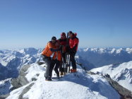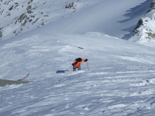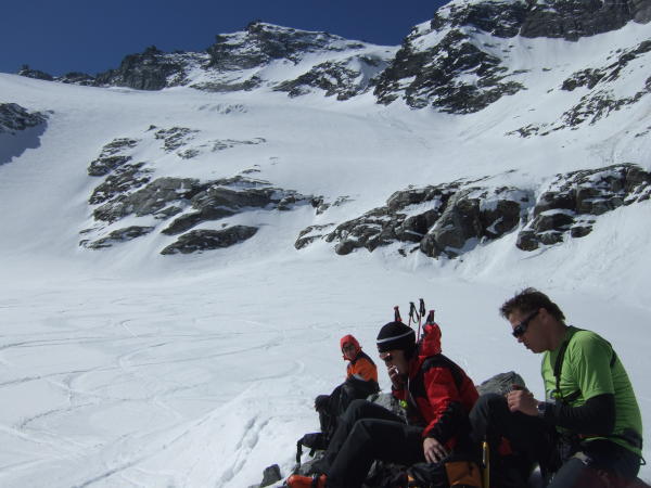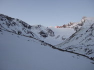 Ab Läntahütte bis Aufschwung Läntagletscher kurze apere Stellen, danach top. Gletscher prima eingeschneit, Harscheisen für gesamten Aufstieg ausreichend.