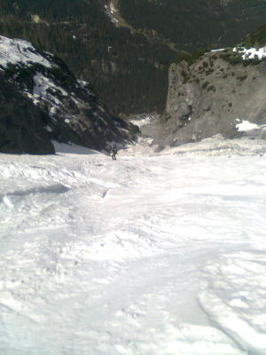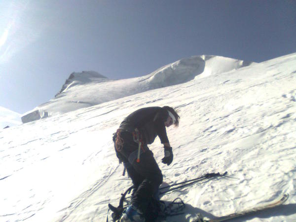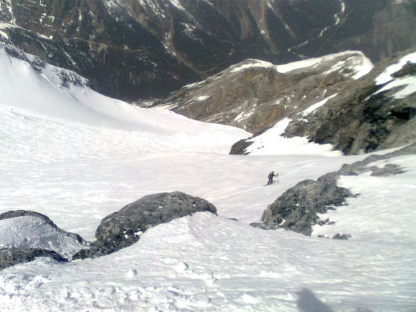 Zur Hütte hoch muss man den halben Weg die Skier tragen, danach grundlos tiefer Schnee. Ab der Hütte morgens gut gefroren, über von Lawinen verwüstetes Gelände - große Eislawine am Sonntag morgen - eine gute Stunde unter den Hängegletschern durch. Die Trafioer Eisrinne hocj durchweg guter Trittschnee, auch ohne Steigeisen begehbar, nur am Ausswtieg zum Normalweg hin, einige Meter blank. Danach windgepresster Pulver hoch bis zu einem blanken Aufschwung - seit Sonntag ist dort eine Reepschnur fixiert - über diesen problemlos hoch aufs Plateau und zum Gipfel.