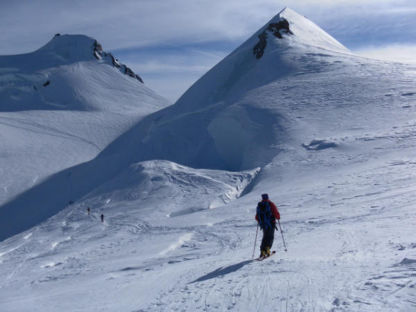 Am Gletscher Harsch, in Nordhängen windverblasener Pulver. Kleine Spalten sind zu.