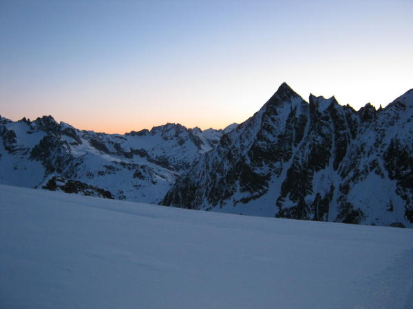 Man kann die Skis direkt beim Rest. Steingletscher anschnallen. Markante, harte Spur, mit zunehmender Höhe immer pulveriger werdend. Es liegen oberhalb rund 2600 Meter etwa 20 Zentimeter Neuschnee, z.T. etwas windgepresst. Der Gipfelhang (nördliche W-Flanke) weist oben schönen Pulverschnee auf, im unteren Teil leichter Deckel. Das Plateau in Richtung Gletscherbruch hat v.a. nördlich noch schönen Pulver, der untere Teil der Steilstufe ab 2400 Meter (bis ca. 2200 Meter) ist schwierig zu befahren (Deckel!). Bis zum Steingletscher dann hart und griffig.