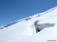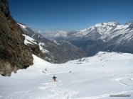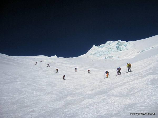 Toller Sonnenschein. Sehr gute Aufstiegspur. In der Schlüsselstelle im Steilhang auf ca. 4'000 m sind Harscheisen empfohlen.