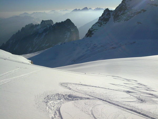 Abfahrt Ostflanke mit Neuschnee machbar. Gletscher pulvrig, stellenweise angesulzt. Von Pt. 2068 führt eine steile Rutschpiste hinunter ins Talende welche in der Mitte eine kurze eisige Steilstufe aufweist.