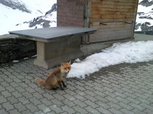 Hotel Schwarenbach sehr empfehlenswert! Abendliche Besucher: zwei Füchse, der eine nähert sich den Leuten bis auf wenige Meter, der andere sitzt oberhalb der Hütte auf den Felsen.