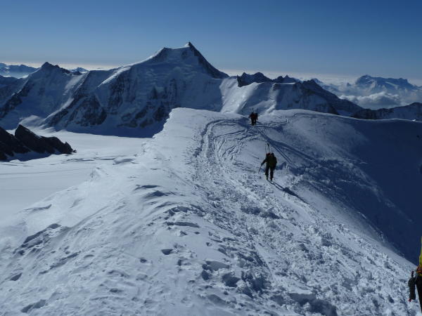 Gute Verhältnisse, Anungletscher gut eingeschneit. Für steilere Passagen Harscheisen hilfreich. Gipfelhang und ein steilerer Aufschwung (ca.3500m) in gutem Trittschnee zu Fuss. In der Abfahrt waren die ersten 300 Höhenmeter ruppig, dann schöner Firn.