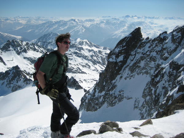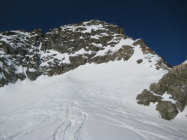 Vom Skidepot zum Gipfel gab's heute zwei Varianten: Wir mit Pickel aber ohne Steigeisen und ein Pärchen mit Steigeisen und Stöcken aber ohne Pickel. Beides möglich. Nur mit Stöcken nicht ratsam. Die Felsen sind z.T. schneefrei und trocken. Gute, leicht vereiste Spur, z.T. auch gute Trittspuren.