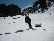 Die Hänge sind bereits alle entladen. Abfahrt um 11.30 Uhr ab Skidepot und um 12.15 Uhr bei der Alp digl Chants angekommen. Es war noch recht hart, da NW-Hänge. Eine Stunde später kein Problem.