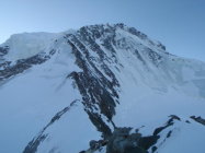 Wir wollten ursprünglich die Westwand (52°) gehen, allerdings hat uns der bereits von der Hütte sichtbare Eispanzer durch die ganze Wand von diesem Vorhaben abgehalten. Man muss wohl den richtigen Zeitpunkt erwischen um diese Wand mit Schneestapfen im Firn machen zu können. Aktuell ist die Wand von diesem Zustand weit entfernt.