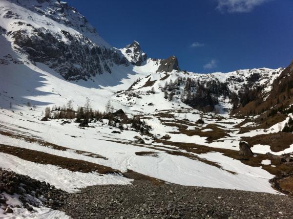 Bis auf 2400 runter Pulver dann gleich rüber auf die andere Hangseite und schöner Sulz. Abfahrt um ca 10.00. Im Aufstig hat der Schnee schön getragen.