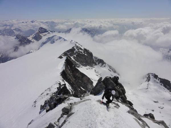 Auf dem Gipfelgrat seilten dann mehrere an - wir hingegen legten hier das Seil ab. Steigeisen und Pickel eindeutig von Vorteil, hatten nicht alle dabei.