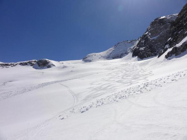 Der Gletscher weist sehr wenig-keine Spalten auf, auch der westliche Basòdino-Gletscher (der üblicherweise mehr Spalten hat) weist im Moment keine sichtbaren Spalten auf. Alle Gruppen ausser wir - auch jene die von Bergführern geführt wurden - stiegen unangeseilt über den Gletscher auf. Viele Einzelgänger.
