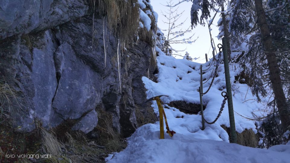 Der Steig durch den Leiterenwald war gefroren und mit einer frischen Schneeschicht von 5cm bedeckt. Die Seile und Ketten der Kletterstellen waren vereist. Ab Ober Grueb (Leiteren) 1’418m bis Punkt 1'913, ca 10cm Neuschnee, Pulver auf harter Unterlage, hervorragend zum Gehen mit den Schneeschuhen. Ab Punkt 1'913 dann sehr steil bis zur Querung unter dem Felsband und etwa 20 – 30cm Pulver auf harter Unterlage. Hoch zum Skidepot dann schon etwas weicher Schnee, aber immer noch gut zu gehen. Der Einstieg über die Nordflanke hoch zum Grat war etwas kritisch mit 30 - 60cm Neuschnee auf Gras und Fels ohne Unterlage. Nicht zu empfehlen ohne Steigeisen und Pickel. Der Grat zum Gipfel und zurück war gut begehbar, im Abstieg über die Nordflanke im Tiefschnee war besondere Vorsicht geboten. Ab Skidepot über Druesberglücke zum Forstberg, ideale Schneeverhältnisse zum Gehen mit Schneeschuhen. Im Abstieg nach Weglosen wurde der Schnee immer weicher bis nass, aber gut zu gehen bis Weglosen.