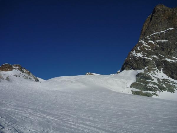 Spalten gut zugeschneit und daher Passage in der Mitte des Gletschers zum Evèque gut machbar. Durchgehend Pulverschnee. Steilstufe ab Pass ca. 100m eisig (wurde zwar auch mit Ski gemacht) aber mit Steigeisen empfehlenswerter. So auch Skidepot bei Pt. 3523. Felsriegel mit Schnee durchsetzt. Im ST-Führer "Bas Valais" ist der Felsriegel erstaunlicherweise nicht erwähnt. Er sollte nicht unterschätzt werden.