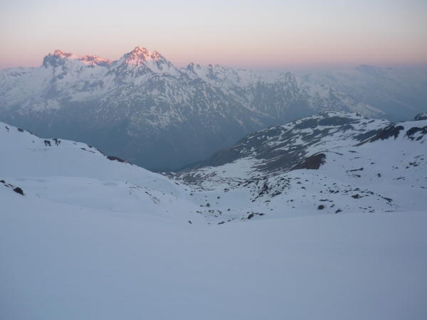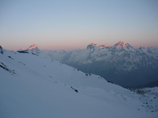 Perfekte Schneeverhältnisse im Aufstieg. Harscheisen sind zwingend.