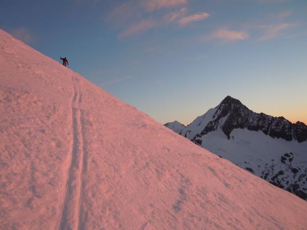 Frühmorgends auf hartem Schnee aufs Gross Wannenhorn. Im obersten Teil sind Harscheisen von Vorteil da es doch recht eisig ist. Die Abfahrt im oberen Teil dannauch recht ruppig, weiter unten Pulverschnee. Anschliessend Aufstieg vom Rotloch in die Böàchilücke und via Galmihornhütte nach Münster. Skitragen ab 2009m.ü.M. Idealer Abfahrt ins Bächital und mit Taxi nach Reckingen.