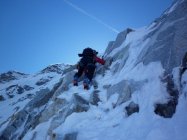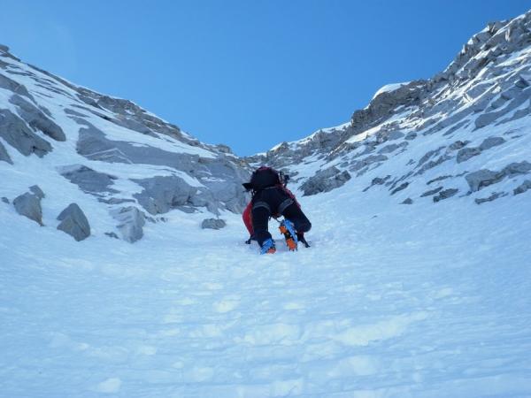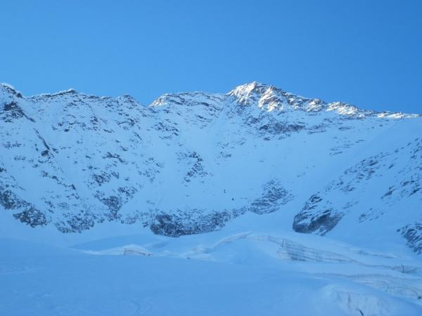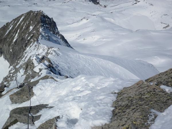 Beim Aufstieg zur Kasselerhütte ca. 300hm Schi zu tragen. Wand selbst in sehr gutem Zustand. Bester Windharsch. Felspassagen etwas heikel. Seilsicherung kaum nötig/möglich. Abfahrt über NW-Flanke