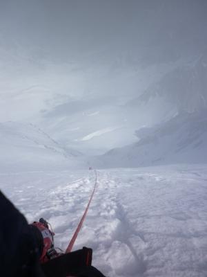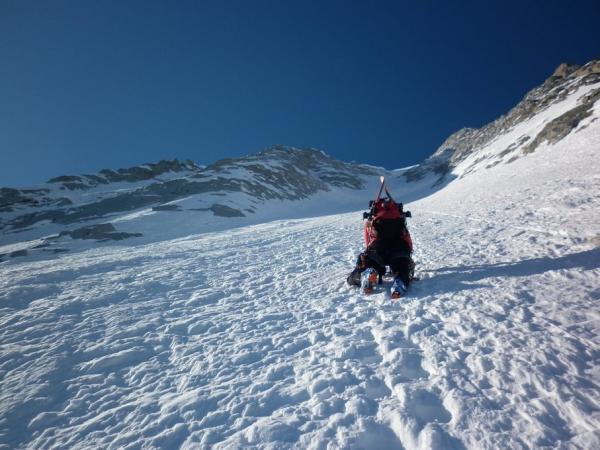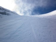 Sehr gute Verhältnisse. Aufstieg durch die gesamte Wand ev. ohne Sicherung möglich. Der obere steile Abschnitt ist zeitweise etwas hart, weshalb wir gesichert haben. Eisschrauben sind unter der Firnschicht gut zu setzen.