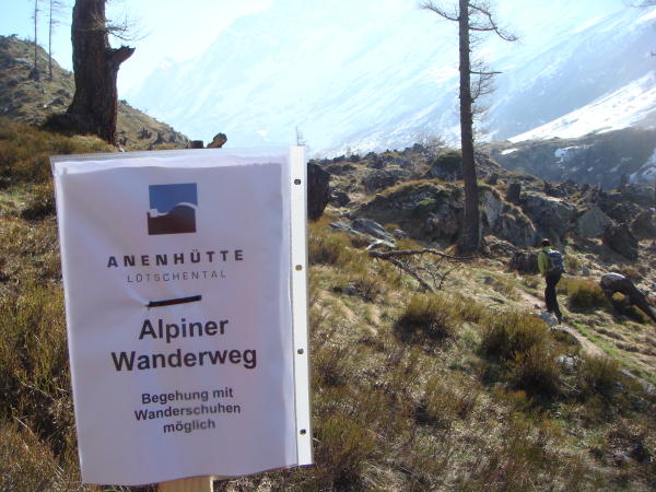 Einige gespurte kurze Schneefelder unterhalb der Anenhütte können sicher und mühelos begangen werden. Der Zustieg ist mit Wanderschuhen gut möglich.