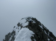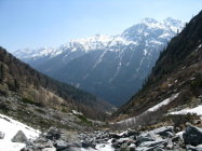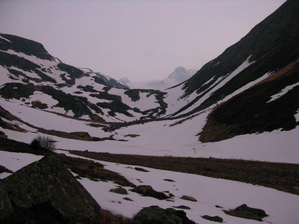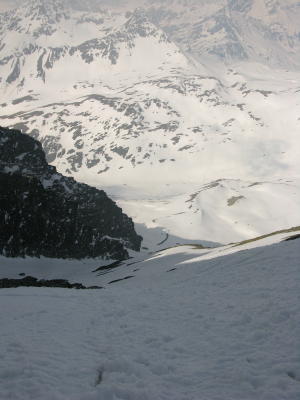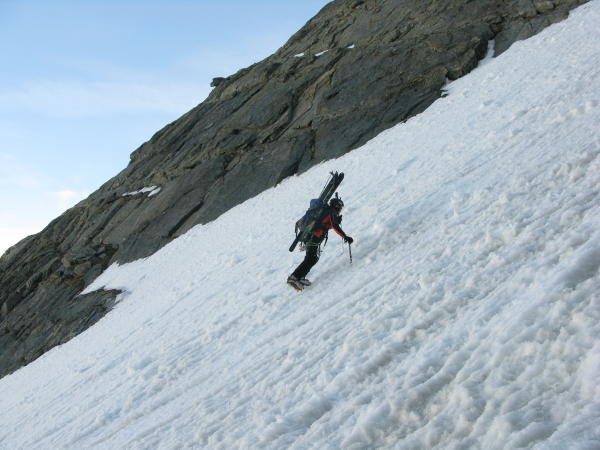 biwak auf 2000 am bach, bis dort ski getragen. danach ab 2200 durchgehend schnee. ganzer aufstieg dank tragendem schnee mit ski am rücken, das heisst, die felle wurden nur am freitag nachmittag für die rekotour gebraucht. sehr sichere verhältnisse, sonne erreicht die westwand erst gegen mittag, im oberen teil schmelzharschkruste mit lustigen wabenförmigen löchern... im allgemeinen spätfrühlingsmässiger schnee,nach etwas sonneneinstrahlung ein vergnügen zum fahren.