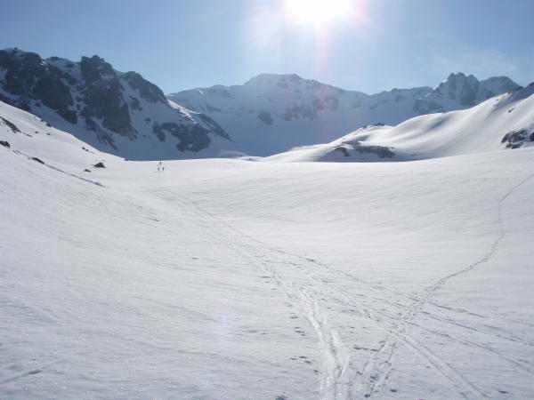 Ich bin bei der Abfahrt der Aufsiegspur gefolgt. Nicht wie im Routenbeschrieb nur den Nordhang, da ich solo unterwegs war. 2cm frischer Pulver bis auf ca. 2500 MüM. Weiter unten schöner Firn, der gleichmässig in Sulz überging.