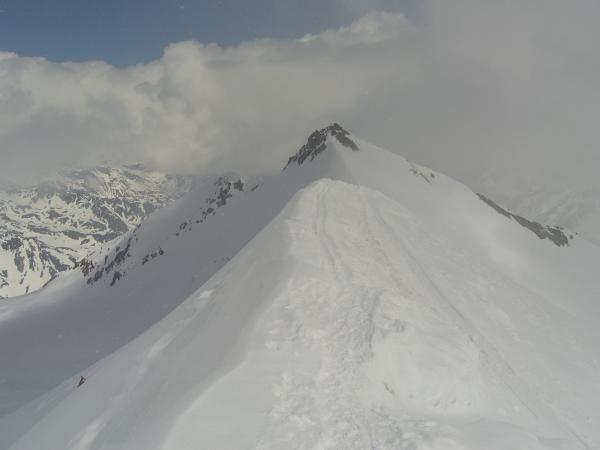 es gab Neuschnee in der Region, jedoch ist der harte, bzw. ab Mittag und in niedrigeren Höhen sumpfige Untergrund nach wie vor bestimmend; am Gipfelaufschwung findet man kurz vorm Grat Blankeis vor, deshalb gute Harscheisentechnik notwendig;
