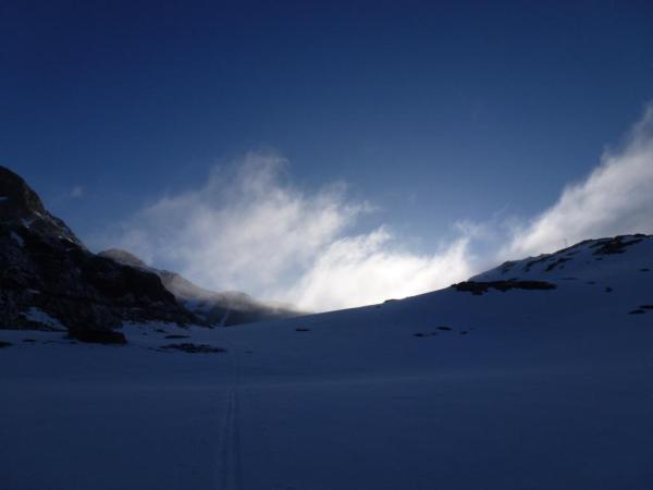 Vom Auto weg müssen die Skis ca. 5 Minuten getragen werden. Im unteren Bereich ca. 5cm Neuschnee, bis zum Gipfelbereich ca. 10cm. Immer noch super Tourenbedingungen im ganzen Grialetschgebiet!