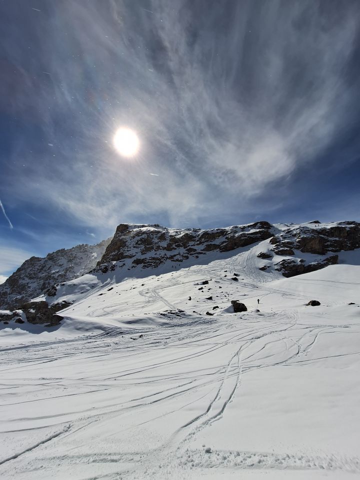 Oben super Pulverschnee und untere Hälfte der Strecke Deckel oder Hartschnee. Im mittleren Teil zur Seilbahn schauen viele Steine aus dem Schnee. Leider ist der Schnee diesen Winter nicht so in grossen Mengen gefallen, darum lieber vorsichtig fahren. Der Steilhang bei der Oberen Sulzbalm ca. 38° ist gut zu bewältigen, mit Vorteil mit Harscheisen. Immer wieder schöne Tour auf einen fast 3000m.
