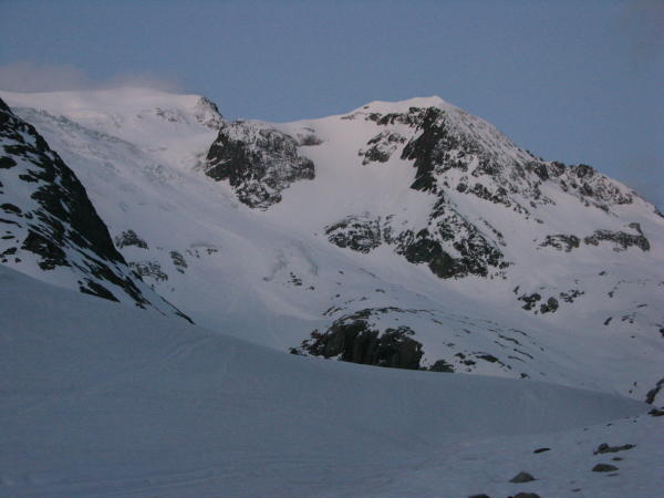 nach klarer nacht tragende schneedecke, ab etwa 2400 presspulver/harschdeckel, die letzten 100m bis zum ausstieg aus der wand wühlerei an der grenze der kraftreserven... hat viel pulver eingeblasen. abfahrt um 12.00 uhr, war genial! unterer teil gerade am aufsulzen, da vormittags einige wolken die sonne etwas dämpften. noch fast bis hotel steingletscher fahrbar.