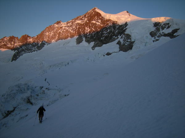 Früher Aufbruch nötig, an die Möglichkeit von Blankeis denken; bei Direktabfahrt schwach ausgeprägte Rinne am Felssporn unterhalb P. 3718 nutzen, um von Seracs wegzubleiben