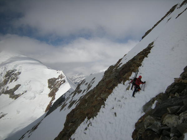 Vorsicht am Grat, sehr brüchig! Gute Sicht für Abfahrt unbedingt nötig, da im oberen Bereich viele Abbrüche. Unbedingt genau an die Route halten. Bei Übergang auf den Aletschletscher zunächst zur Mittelmoräne, dieser dann bis Konkordiaplatz folgen bis zu den vielen Spuren zur Konkordiahütte.
