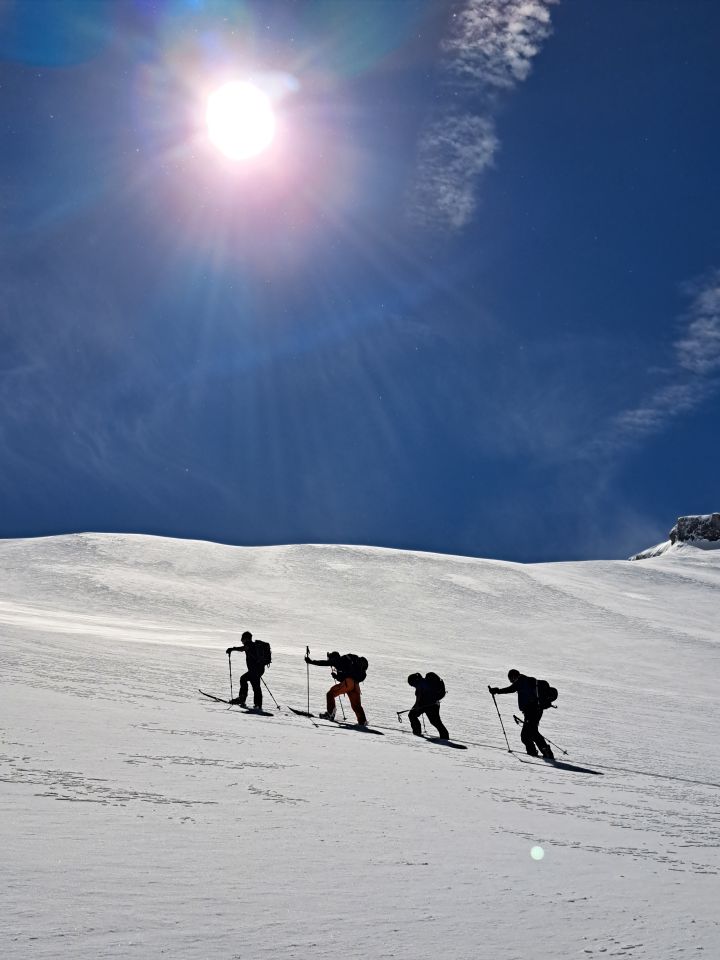 Anstrengend beim Spuren. Oben sind wir nicht zum Gipfel des Daubenhorns, sondern nach rechts zum Daubenjoch, weil uns der Gipfelhang des Daubenhorns bei den aktuellen Verhältnissen zu steil war.