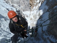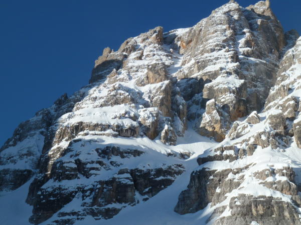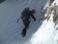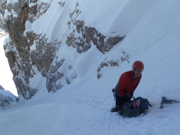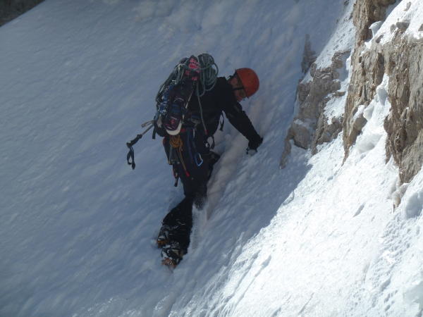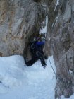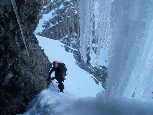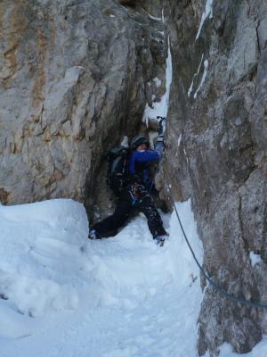 die Schlüsselstellen sind zwei kurze Kaminverschneidungen (je etwa 10-15 Meter hoch)glatter, abwärtsgeschichteter Felsen mit heiklen Stehern für die Steigeisen. das Ganze ist tw. von einer fingerdicken Wassereisschicht überzogen. Schwierigkeit je nach Stellen: International M 11- M14