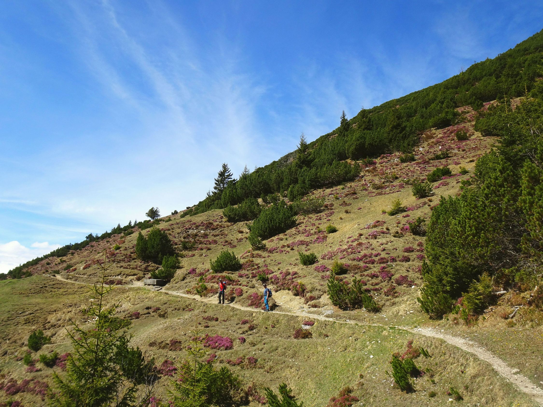 Wetter warm und sonnig, oben etwas Wind. Gute Fernsicht, nur nach Süden hin Quellwolken. Am Gipfel einige Wanderer, die von der Muttersbergbahn kamen, im Auf- und Abstieg nur wenige Leute getroffen.