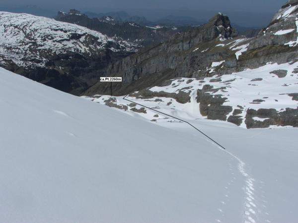Guter Trittschnee, am späten Nachmittag unter 2300m Einbrüche bis Kniehöhe.