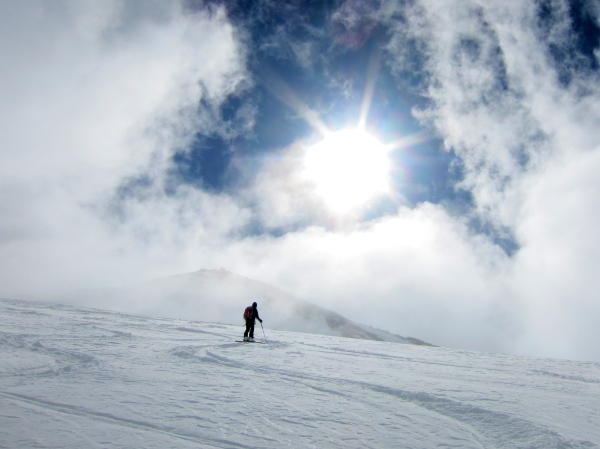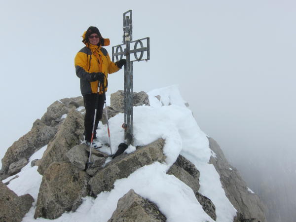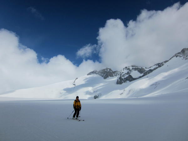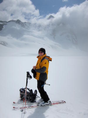 Vom Belvedere kurzes Skitragen bis zur Eisgrotte, dann über den knapp, aber noch genügend eingeschneiten Rhonegletscher. Die Steilstufe beim Gletscherbruch auf 2700 m wird problemlos rechts umgangen, Harscheisen waren angenehm, aber nicht zwingend. Der Schnee war von Anfang an gut gefroren und tragend bis zum Gipfel. Leider kamen immer mehr Wolken auf und bei der Abfahrt war die Orientierung durch dicken Nebel erschwert. Wir sind um 1100 abgefahren. Bis 2800 m gute Schneeverhältnisse, dann nass bis Belvedere, es kamen im unteren Teil einige Spalten zum Vorschein.
