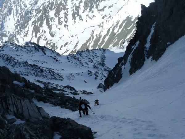 Szenerie im Couloir ist wirklich der Oberhammer! Felszacken links und rechts und im Hintergrund der Mt. Blanc!