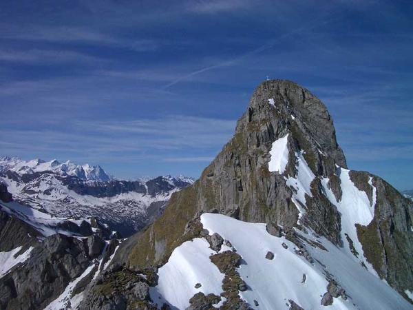 südseitig alles schneefrei, die nordwestseitige umgehung des gruebikopfes bedingt infolge des sehr harten schnees einen pickel (ev. sogar steigeisen). am letzten gipfelaufbau kann zur zeit noch nicht bis in die leichte rinne abgestiegen werden, da noch steiler aufgeweichter schnee liegt. der daher etwas direktere aufstieg ist nicht viel schwerer, aber teilweise trittarm.