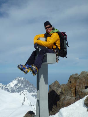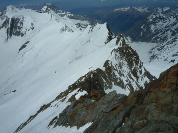 Solange wir auf Steigeisen gingen, konnte ich noch ganz gut mithalten, später auf Skiern dann nicht mehr; da waren sie sehr schnell (=ital. Rennsemmeln!). Kein Frühstück am Frühstücksplatz, nur Steigeisen runter, Felle&Harscheisen drauf und weiter gings. Sie überholten Seilschaft um Seilschaft und mein Abstand zu ihnen wurde immer größer. Den Hugisattel erreichte ich nach gut 3Std., was im Führer mit 3,5 angegeben ist. Auch hier kaum Pause, sondern wieder Umstieg auf Steigeisen und Seilschaften bilden. Ruggero steigt vor und sichert Filippo und mich am Ende des 45m langen Seils an einer ital. Spezialweiche nach. Alle anderen Seilschaften gingen am kurzen bzw. laufenden Seil. Nach 1,5 Std. waren wir am Gipfel. Es ist recht viel Platz da oben, so dass auch die nachkommenden Seilschaften sich für eine Pause niederlassen konnten. Wahnsinns Aussicht!! Wallis! Mont Blanc!!