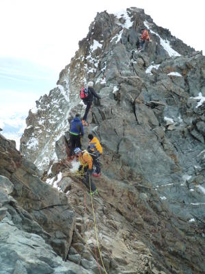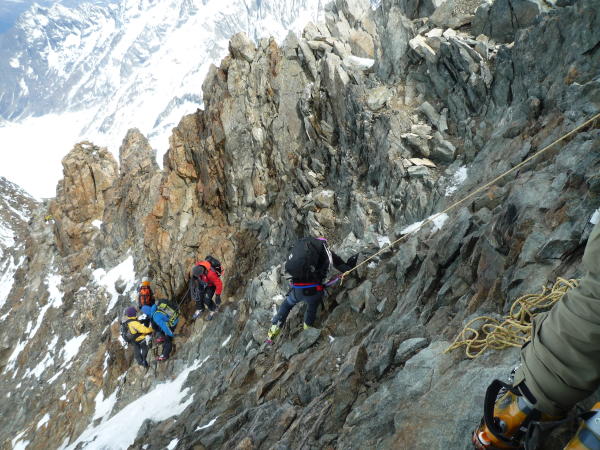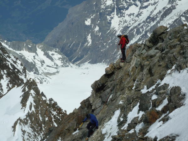 Am Grat sommerliche Verhältnisse im Sinne von aperem, griffigem, dankbar gegliedertem Fels, wenig Firnreste dazischen; nur eine Stelle etwas eisig.