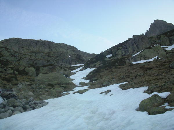 Im ersten Hang ist der Schnee knapp, es gibt kurze Tragestrecken. Danach (ab 2200 MüM) sehr gute Verhältnisse bis zum Gipfel. Da der Wetterbericht betreffend der fehlenden Abstrahlung glücklicherweise unrecht hatte, war der Schnee bis 2200 MüM hinunter trotz hoher Temperaturen durchgefroren. Abfahrt um 10.00: Super bis fast ganz runter, Firn, Sulz oder hart bis 2200 MüM hinunter, dann ein Wechsel von Ski ausziehen und Nassschnee schwingen.