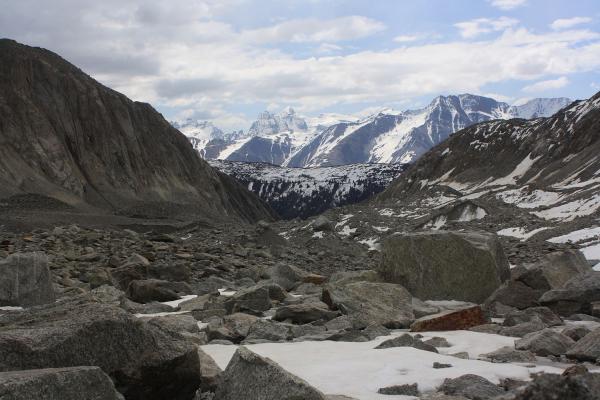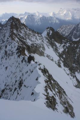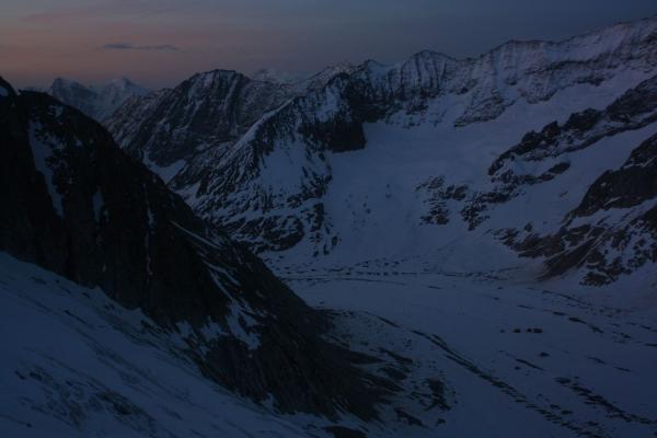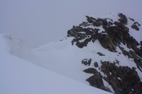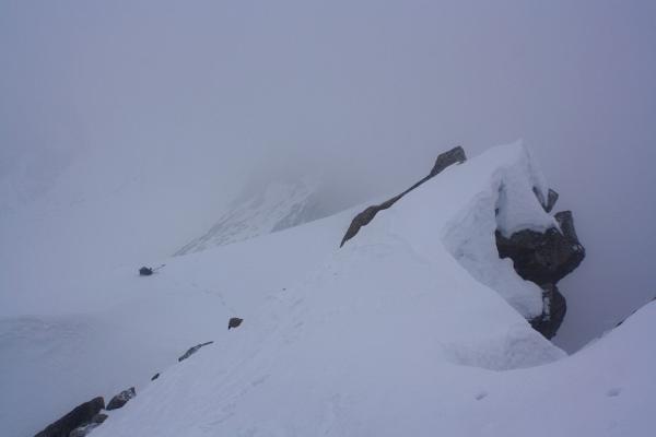 Kein Eis angetroffen, sehr guter Trittschnee. Geröllaufstieg vom Beichgletscher über Moräne und Schuttfelder über P.2804m zu P.2988m etwas mühsam in der Nacht. Leider Nebel und Graupelschauer am Gipfel angetroffen. Früh starten so dass der Schnee noch im Abstieg hart ist!