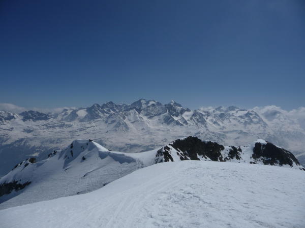 Von der Passstrasse weg Schnee. Am Gipfelaufbau noch Pulver. Tolle Aussicht in Bernina und Bergell
