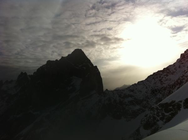 Der Gletscher ist vom Wetterhoch der letzten Wochen sehr fest ausgeapert und noch zerklüfteter und eher schlechter eingeschneit als andere Jahre. Vom Schneefall des letzten Wochenendes, lag nun eine im Aufstieg bereits ziemlich weiche Sulzschneeschicht ( morgen früh noch nicht tragender Bruchharst), welche den Aufstieg recht mühsam machte, weil man immer wieder einsinkt.
